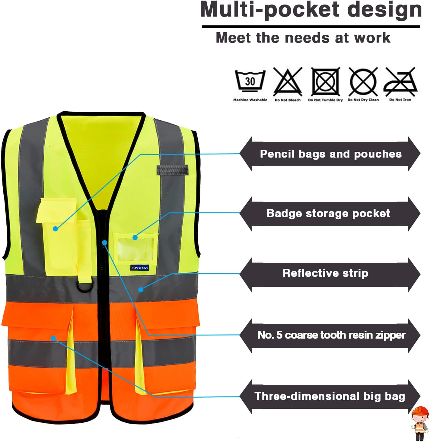 سترة السلامه المهنية اللون الاورانج والاصفر السترة التي تجمع بين اللونين الاورانج و الأصفر تجمع بين فوائد كلا اللونين: 1. الرؤية العالية: وجود اللون الاورانج (أو الاورانج الفسفوري) يضمن أن مرتديها واضح وظاهر للعيان، مما يزيد من سلامته. 2. التعريف بالوظيفة: وجود اللون و الأصفر (غالبًا على شكل شرائط أو أقسام) يساعد في تحديد هوية مرتديها أو دوره. على سبيل المثال: o قد تكون سترة مشرف موقع بناء: حيث يعزز الاورانج من كونه مشرفًا، بينما يضمن و الأصفر سلامته بين المعدات والعمال. o سترة عامل في المطار: حيث يحتاج إلى أن يكون مرئيًا (الاورانج) ولكن لونه الرسمي أو تعريف فريقه هو الاورانج. o سترة شرطي مرور أو أمن: للحصول على رؤية عالية مع الاحتفاظ بالهوية المؤسسية المواصفات القياسية المهمة بغض النظر عن اللون، يجب أن تفي السترات بمعايير السلامة لضمان فعاليتها. • المواد العاكسة (Reflective Tape): يجب أن تحتوي على شرائط عاكسة (غالبًا فضية أو بيضاء) تعكس ضوء المصابيح الأمامية للسيارات في الليل