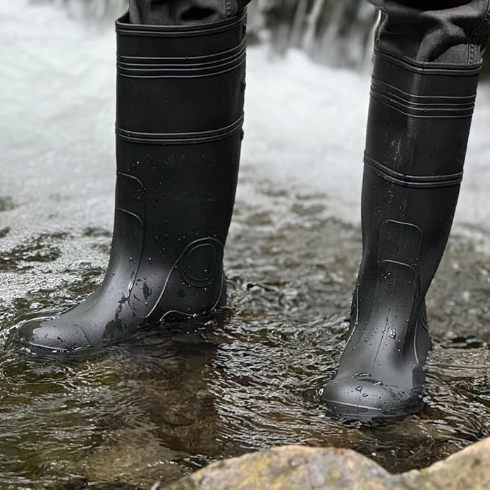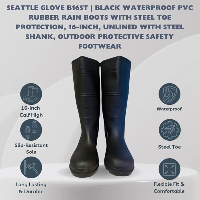 حذاء مطر صناعي من المطاط PVC مقاوم للماء B16ST باللون الأسود مع حماية أصابع من الفولاذ، طول 16 إنش، بدون بطانة مع دعامة فولاذية، أحذية أمان واقية للأنشطة الخارجية (زوج واحد) حماية بأصبع قدم فولاذي: هذه الأحذية تلبي معايير السلامة الصارمة ASTM F2413 للحماية من الصدمات والانضغاط، وهي مناسبة لبيئات العمل الخطرة. ارتفاع 16 بوصة: يوفر تغطية ممتدة حتى أعلى الساق، مما يوفر حماية إضافية ضد الرذاذ والحطام. دعم نصل فولاذي: النصل الفولاذي المدمج يقوي هيكل الحذاء، مما يساعد في دعم قوس القدم ويقلل من التعب. تصميم مقاوم للماء: مصنوع من مادة PVC بدون درزات، هذه الأحذية توفر حماية كاملة ضد الماء، وتحافظ على القدمين جافة في الظروف الرطبة والطينية. هيكل PVC: مقاوم للزيوت والمواد الكيميائية والخدوش، مما يضمن المتانة والاستخدام طويل الأمد في البيئات الصناعية. ثبات موثوق: الأرضية الخارجية مصممة لتوفير grip موثوق على الأسطح الزلقة، مما يزيد من السلامة أثناء المهام البدنية.