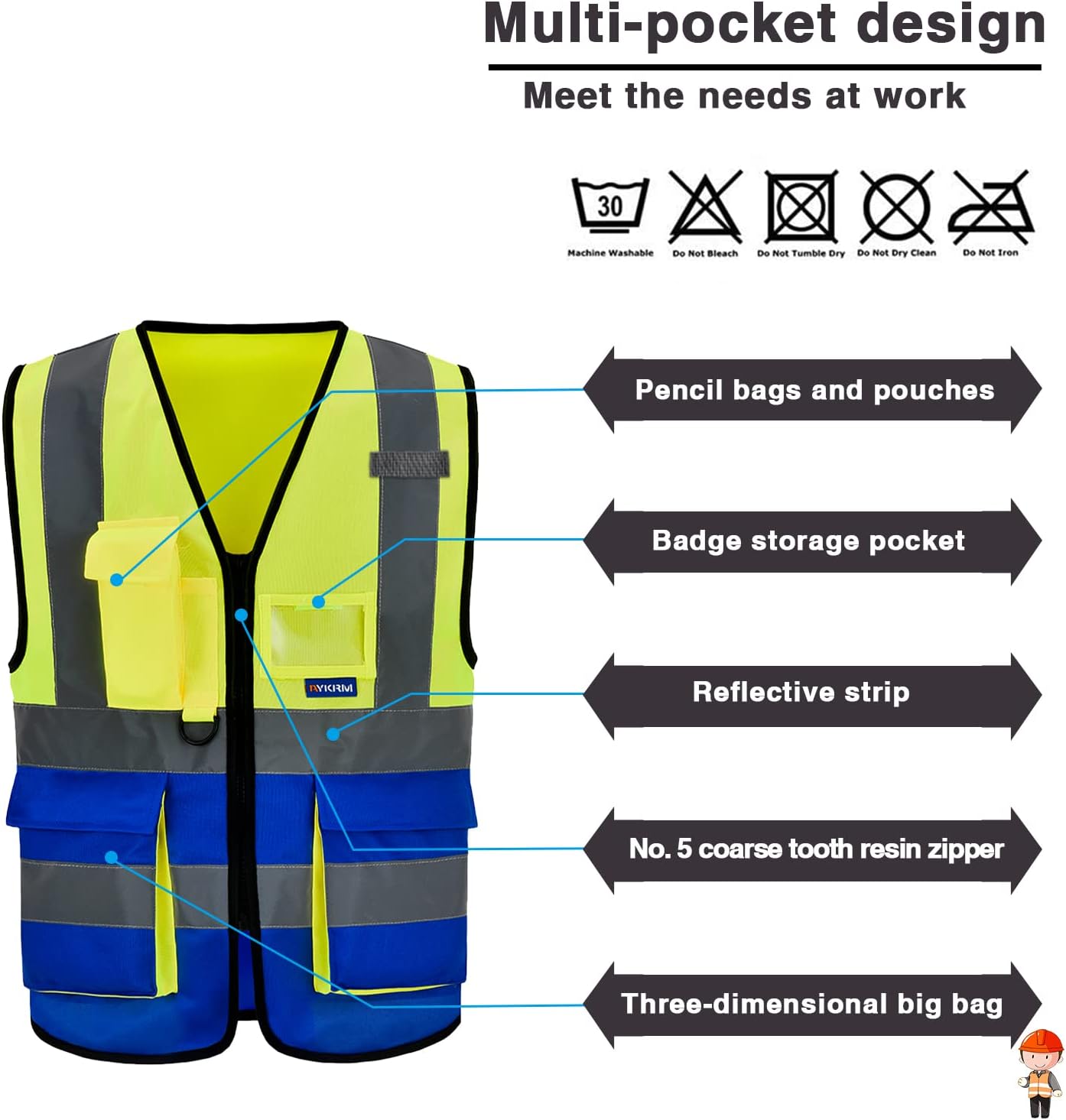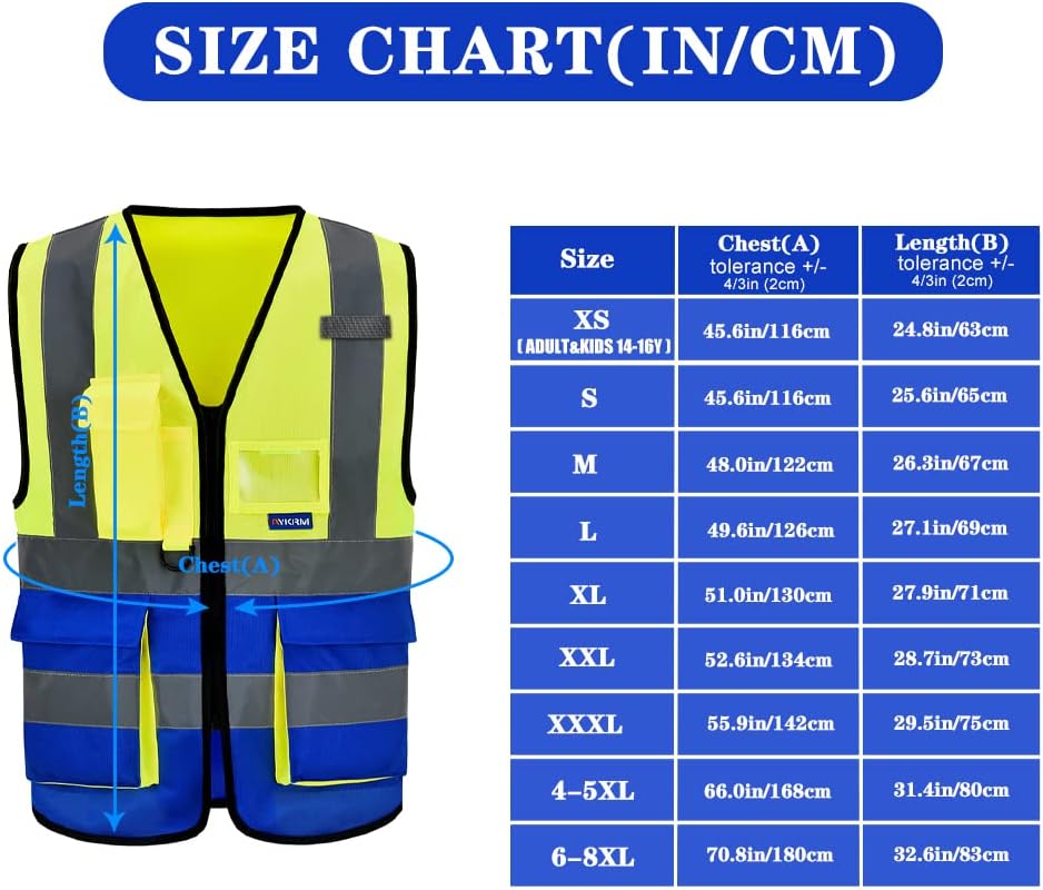 السترة التي تجمع بين اللونين الأصفر والأزرق تجمع بين فوائد كلا اللونين: 1. الرؤية العالية: وجود اللون الأصفر (أو الأصفر الفسفوري) يضمن أن مرتديها واضح وظاهر للعيان، مما يزيد من سلامته. 2. التعريف بالوظيفة: وجود اللون الأزرق (غالبًا على شكل شرائط أو أقسام) يساعد في تحديد هوية مرتديها أو دوره. على سبيل المثال: قد تكون سترة مشرف موقع بناء: حيث يعزز الأزرق من كونه مشرفًا، بينما يضمن الأصفر سلامته بين المعدات والعمال. سترة عامل في المطار: حيث يحتاج إلى أن يكون مرئيًا (أصفر) ولكن لونه الرسمي أو تعريف فريقه هو الأزرق. سترة شرطي مرور أو أمن: للحصول على رؤية عالية مع الاحتفاظ بالهوية المؤسسية المواصفات القياسية المهمة بغض النظر عن اللون، يجب أن تفي السترات بمعايير السلامة لضمان فعاليتها. المواد العاكسة (Reflective Tape): يجب أن تحتوي على شرائط عاكسة (غالبًا فضية أو بيضاء) تعكس ضوء المصابيح الأمامية للسيارات في الليل