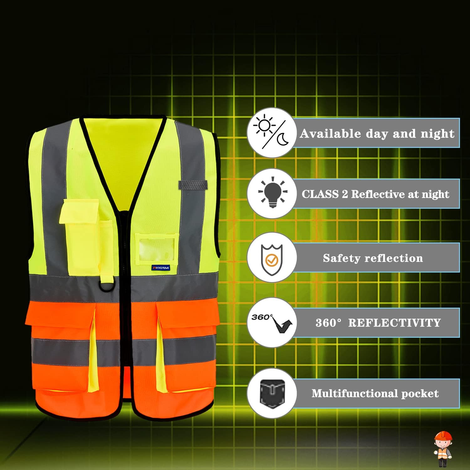 سترة السلامه المهنية اللون الاورانج والاصفر السترة التي تجمع بين اللونين الاورانج و الأصفر تجمع بين فوائد كلا اللونين: 1. الرؤية العالية: وجود اللون الاورانج (أو الاورانج الفسفوري) يضمن أن مرتديها واضح وظاهر للعيان، مما يزيد من سلامته. 2. التعريف بالوظيفة: وجود اللون و الأصفر (غالبًا على شكل شرائط أو أقسام) يساعد في تحديد هوية مرتديها أو دوره. على سبيل المثال: o قد تكون سترة مشرف موقع بناء: حيث يعزز الاورانج من كونه مشرفًا، بينما يضمن و الأصفر سلامته بين المعدات والعمال. o سترة عامل في المطار: حيث يحتاج إلى أن يكون مرئيًا (الاورانج) ولكن لونه الرسمي أو تعريف فريقه هو الاورانج. o سترة شرطي مرور أو أمن: للحصول على رؤية عالية مع الاحتفاظ بالهوية المؤسسية المواصفات القياسية المهمة بغض النظر عن اللون، يجب أن تفي السترات بمعايير السلامة لضمان فعاليتها. • المواد العاكسة (Reflective Tape): يجب أن تحتوي على شرائط عاكسة (غالبًا فضية أو بيضاء) تعكس ضوء المصابيح الأمامية للسيارات في الليل
