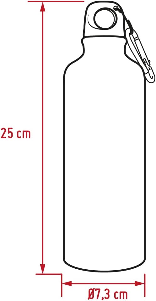 زجاجة ألومنيوم خالية من مادة BPA، سعة ٧٥٠ مل، مزودة بغطاء لولبي وحلقة تثبيت. متوفرة بستة ألوان. مثالية للطباعة الدوارة أو النقش بالليزر. غير مناسبة للسوائل الغازية أو المجمدة. لا يُنصح باستخدامها في غسالة الأطباق. معبأة بشكل فردي في علبة هدايا صديقة للبيئة. الأبعاد: القطر ٧ سم × الارتفاع ٢٥ سم.