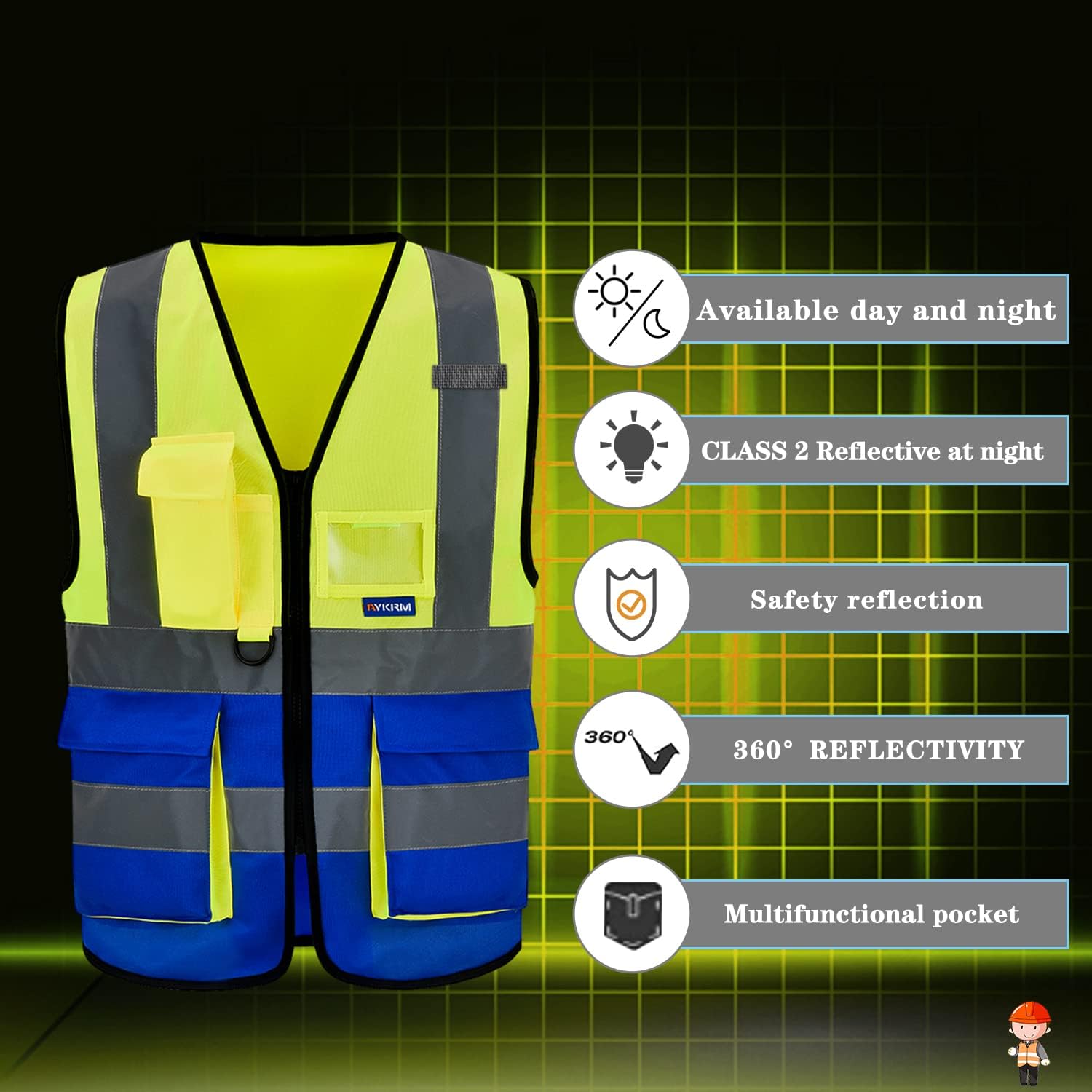 السترة التي تجمع بين اللونين الأصفر والأزرق تجمع بين فوائد كلا اللونين: 1. الرؤية العالية: وجود اللون الأصفر (أو الأصفر الفسفوري) يضمن أن مرتديها واضح وظاهر للعيان، مما يزيد من سلامته. 2. التعريف بالوظيفة: وجود اللون الأزرق (غالبًا على شكل شرائط أو أقسام) يساعد في تحديد هوية مرتديها أو دوره. على سبيل المثال: قد تكون سترة مشرف موقع بناء: حيث يعزز الأزرق من كونه مشرفًا، بينما يضمن الأصفر سلامته بين المعدات والعمال. سترة عامل في المطار: حيث يحتاج إلى أن يكون مرئيًا (أصفر) ولكن لونه الرسمي أو تعريف فريقه هو الأزرق. سترة شرطي مرور أو أمن: للحصول على رؤية عالية مع الاحتفاظ بالهوية المؤسسية المواصفات القياسية المهمة بغض النظر عن اللون، يجب أن تفي السترات بمعايير السلامة لضمان فعاليتها. المواد العاكسة (Reflective Tape): يجب أن تحتوي على شرائط عاكسة (غالبًا فضية أو بيضاء) تعكس ضوء المصابيح الأمامية للسيارات في الليل